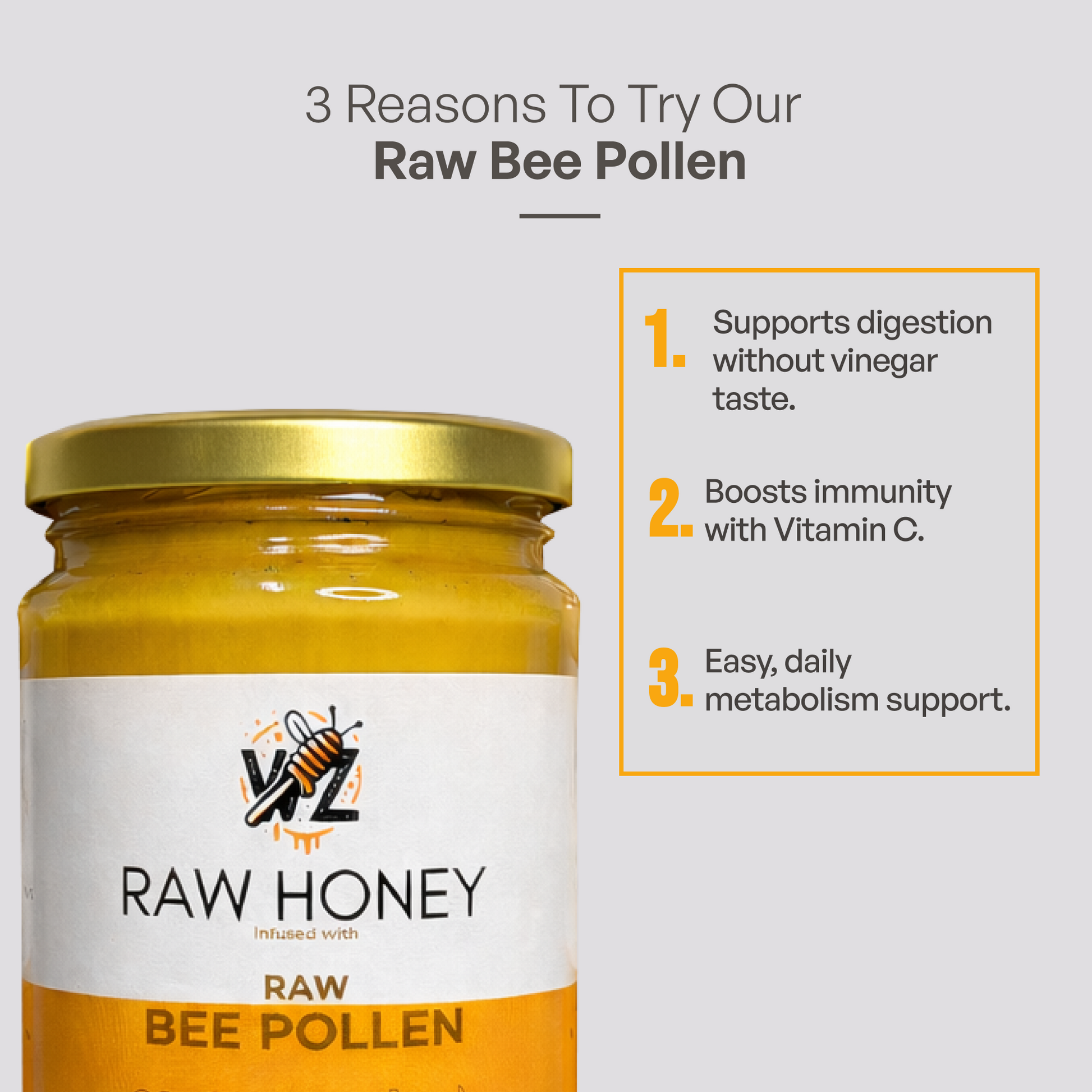 Ingredients: Raw wildflower honey, raw organic bee pollen